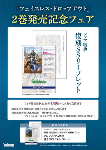 - 特典配布は、カドカワBOOKS『フェイスレス・ドロップアウト』1巻及び、2026/1/9(金)発売『フェイスレス・ドロップアウト 2 無貌の引退傭兵は戦略物資を確保したい』が対象となります。