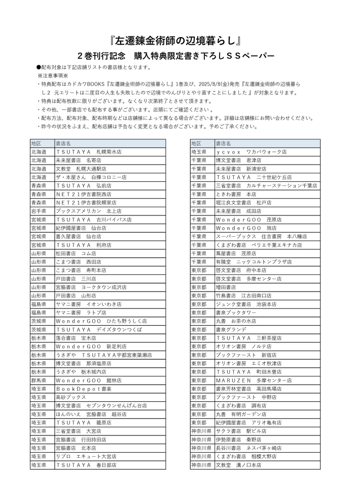 企画実施店舗で、カドカワBOOKS『左遷錬金術師の辺境暮らし』1~2巻のいずれか1冊をお買い上げの方に、SSペーパー【可愛くない弟、妹達】を差し上げます。