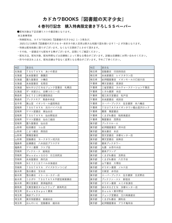 企画実施店舗で、カドカワBOOKS『図書館の天才少女 ~本好きの新人官吏は膨大な知識で国を救います!~』1~4巻のいずれか1冊をお買い上げの方に、SSペーパーを差し上げます。
